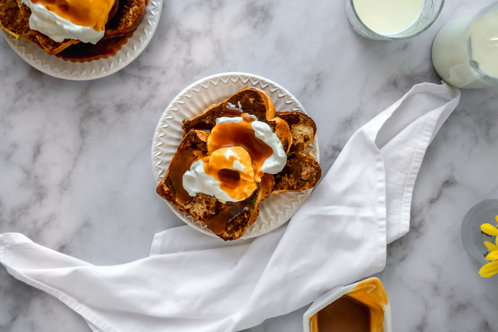 - Top with salted butter caramel and whipped cream or your favorite french toast toppings!