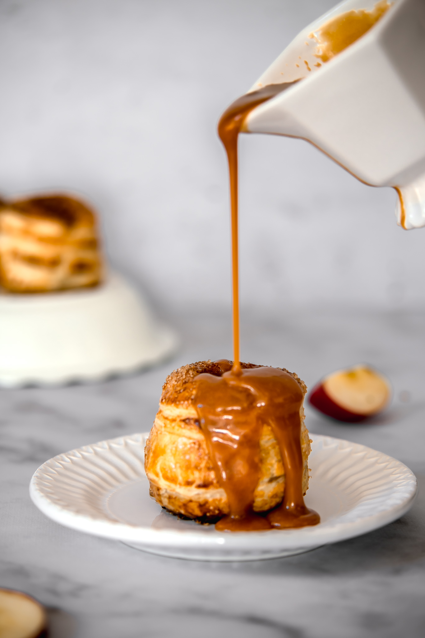 I peeled and cored the apples, but left them whole. After tossing them in cinnamon sugar (because why not?) I wrapped them in strips of puff pastry, then popped them in the freezer to set up. While they were chilling, I whipped up a half batch of salted butter caramel. When the caramel cooled, I decided to pipe some into the center of the apple where the core was. Then finished them off by brushing the puff pastry with an egg wash and sprinkling each apple with a nice layer of cane sugar.