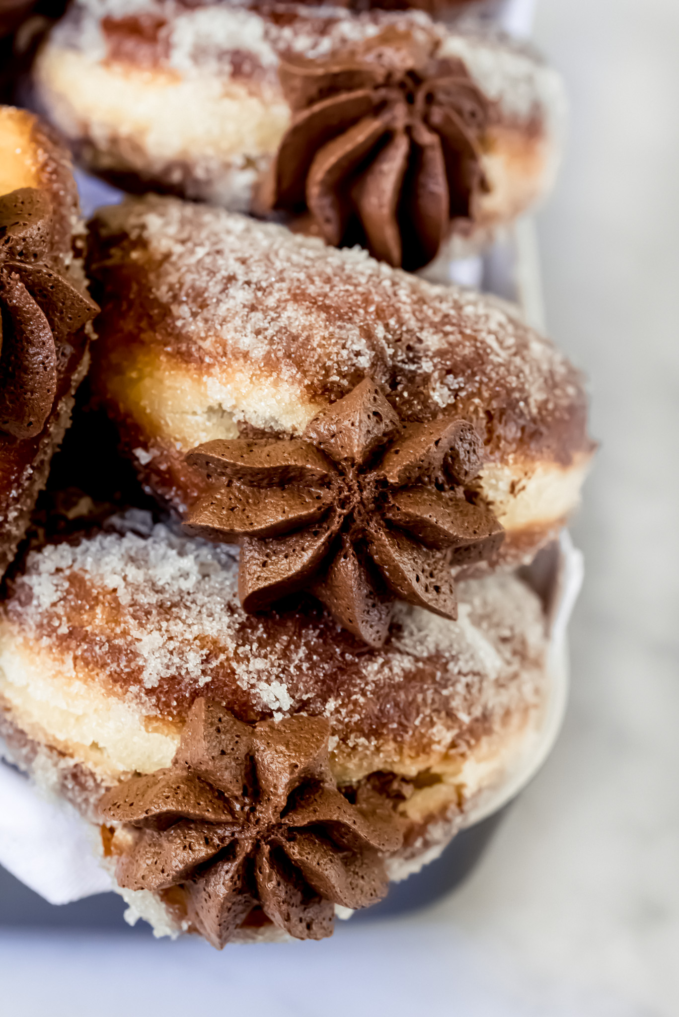- When the doughnuts are cooled, whisk the ganache in a stand mixer until light & fluffy. Then transfer to a piping bag with piping tip.